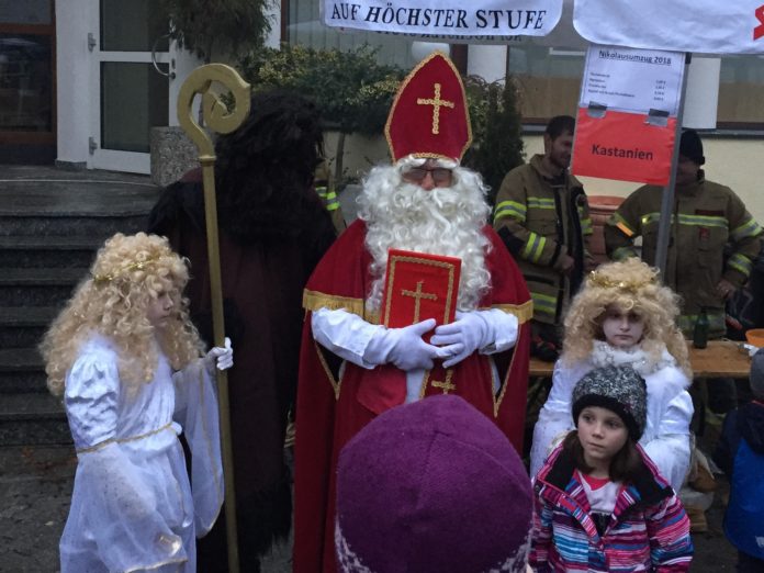 Den Einzug des Nikolauses verfolgten die kleinen Gäste gespannt und wurden mit einer Kleinigkeit aus dem Korb von Knecht-Ruprecht überrascht.